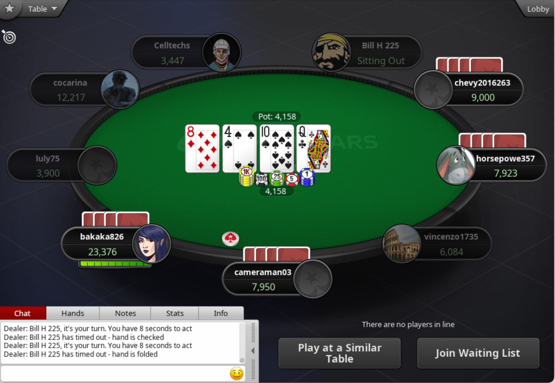 After you sign in, you’ll be in the lobby, where you can see the active tables, a list of upcoming tournaments and recent chat.